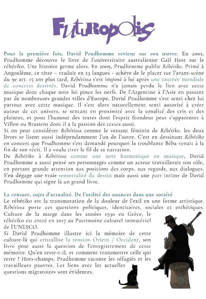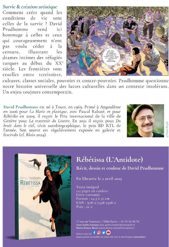 Livre "Rebetissa" de David Prudhomme Anne-Gaëlle FontaineRelations Publiques & MédiasAssistée de Manon Dumas-Morès : manon.dumas-mores@futuropolis.fr