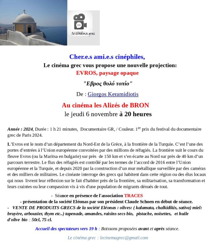 BRON (69) Projection : Evros , paysage opaque ""Εβρος θολό τοπίο" le 6 novembre