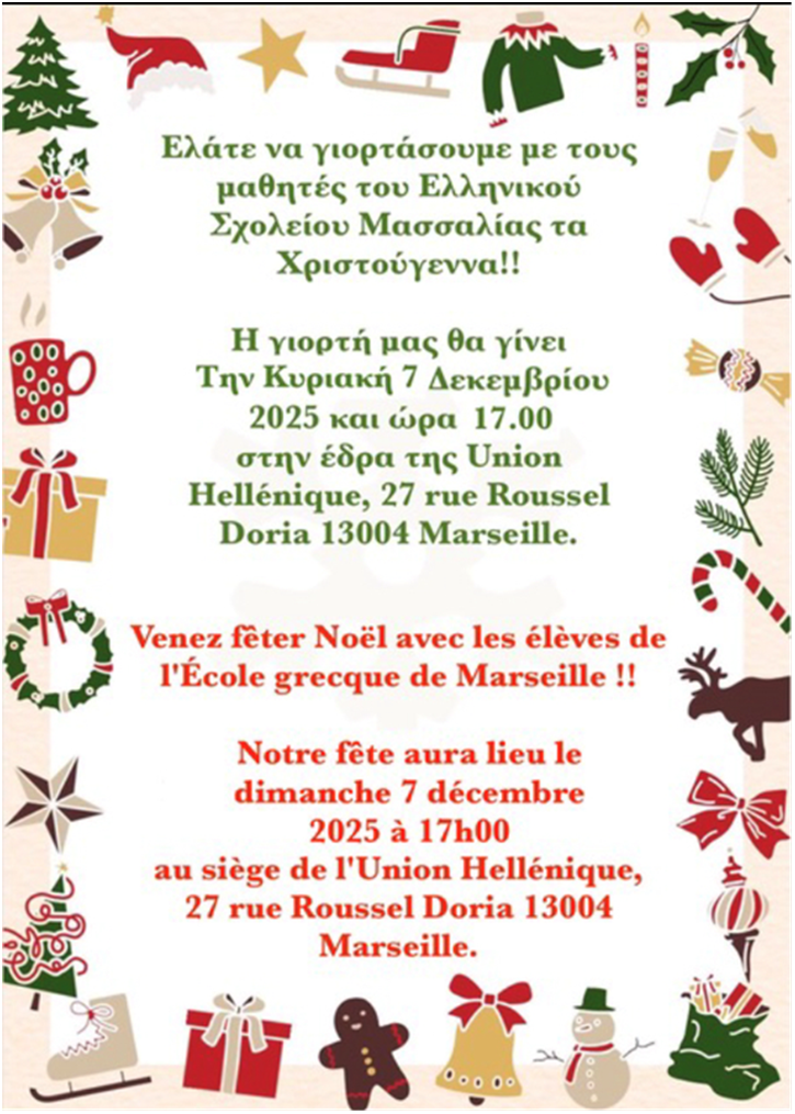 Η Ελληνική Ένωση Μασσαλίας και Περιχώρων σας προσκαλεί στη Χριστουγεννιάτικη γιορτή του Ελληνικού Σχολείου που θα γίνει την Κυριακή 7 Δεκεμβρίου 2025 και ώρα 5 μ.μ στο χώρο της Ελληνικής Ένωσης,