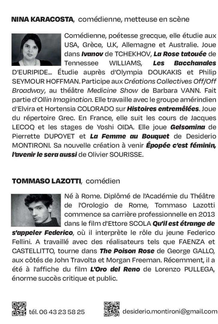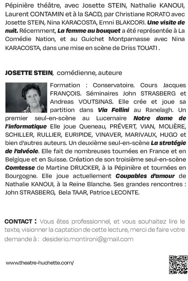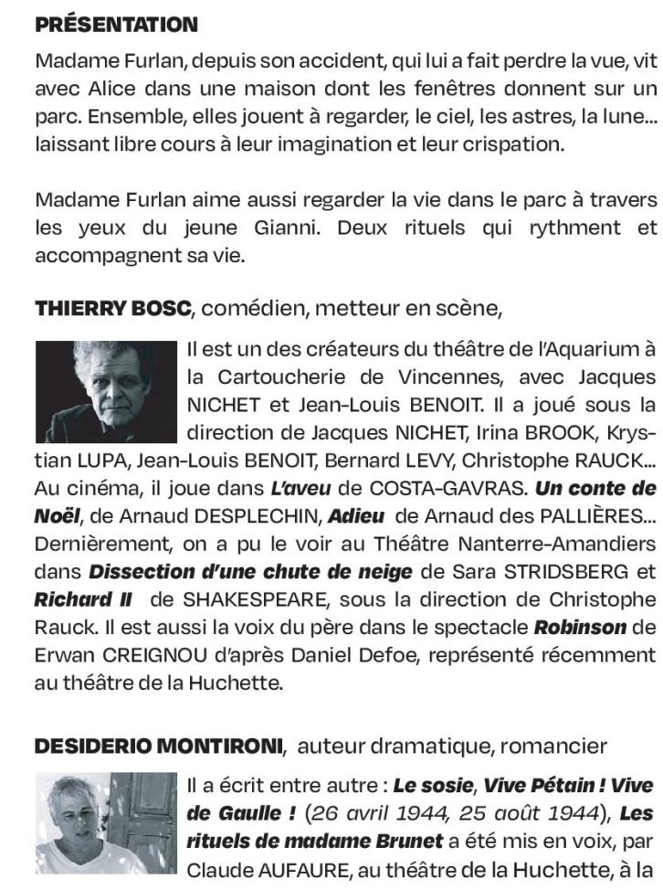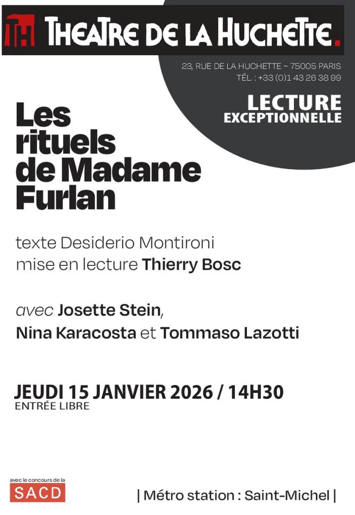 Nous serons heureux de votre présence à la lecture de la pièce «Les rituels de madame Furlan» de Desiderio Montironi, avec Josette Stein, Nina Karacosta et Tommaso Lazotti, au théâtre de la Huchette, jeudi 15 janvier à 14h30. Entrée libre.