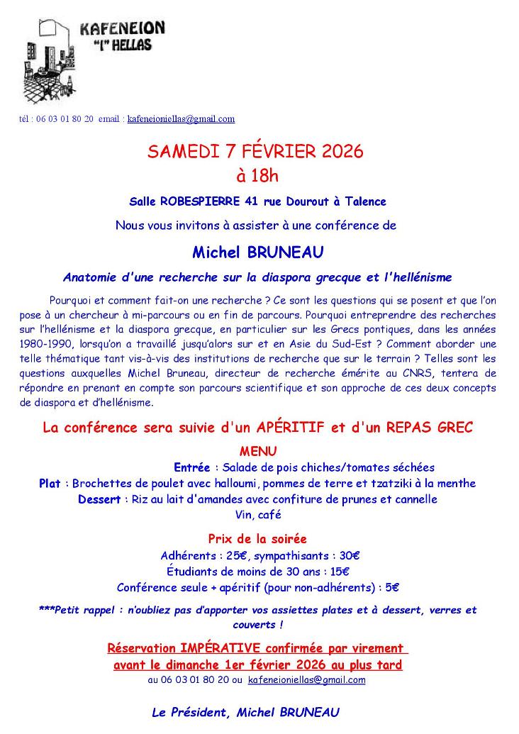 La conférence sera suivie d'un APÉRITIF et d'un REPAS GREC