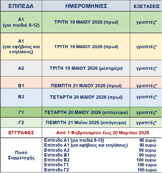 Οι ακριβείς ώρες των γραπτών εξετάσεων θα σας κοινοποιηθούν αργότερα.