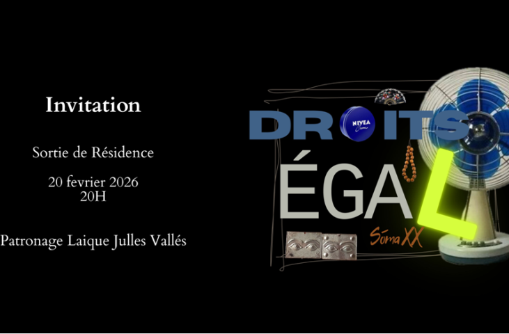 La compagnie Sόma XX a le plaisir de vous inviter à la sortie de résidence de notre spectacle Droits ÉgaL le 20 février 2026 à 20h, au Patronage Laïque Jules Vallès – 72 avenue Félix Faure, 75015 Paris.