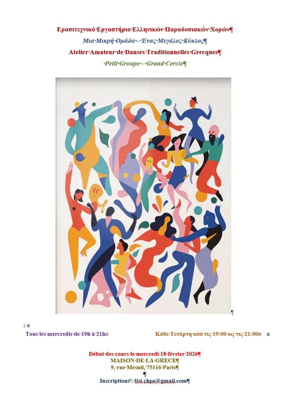 Η Ελληνική Κοινότητα Παρισιού και περιχώρων σας προσκαλεί με ιδιαίτερη χαρά όλους, ανεξαρτήτως ηλικίας, εμπειρίας ή επιπέδου, κάθε Τετάρτη στις 19:00, στο Ελληνικό Σπίτι, σε ένα ερασιτεχνικό εργαστήριο παραδοσιακών ελληνικών χορών, αφιερωμένο στη διατήρηση και τη μετάδοση της ελληνικής πολιτιστικής κληρονομιάς.