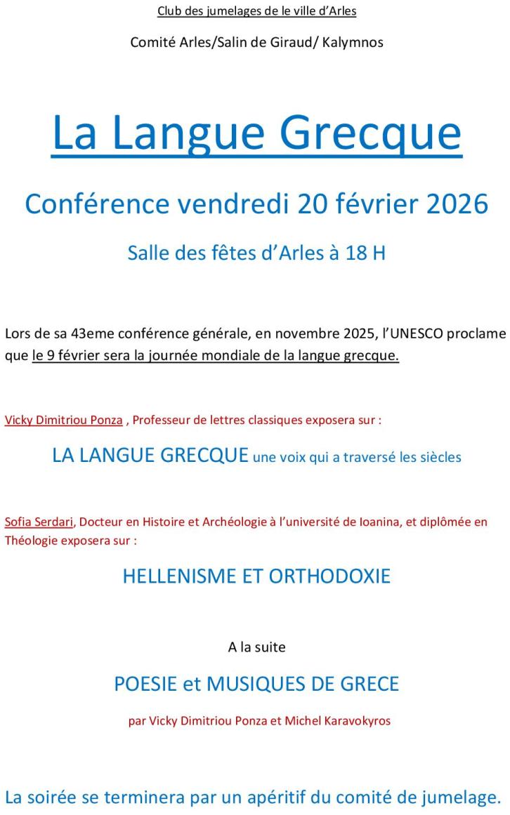 Le comité de jumelage Arles/Salin de Giraud/ Kalymnos vous invite à participer à une conférence très intéressante, sur la langue Grecque, hellénisme et l' Orthodoxie...