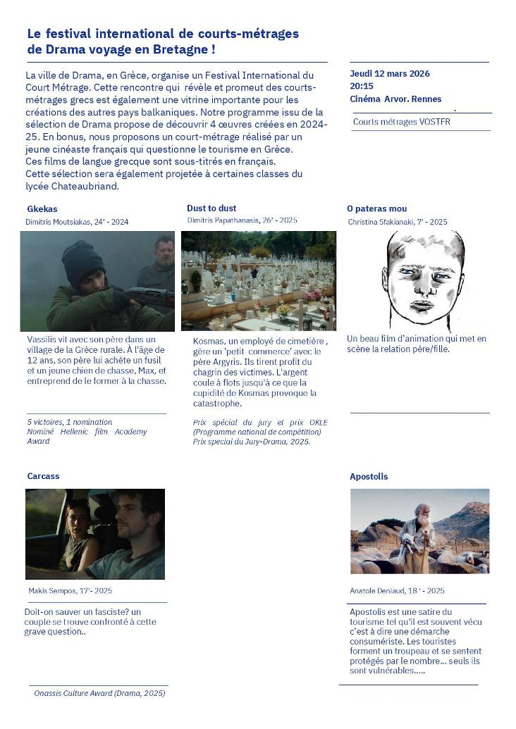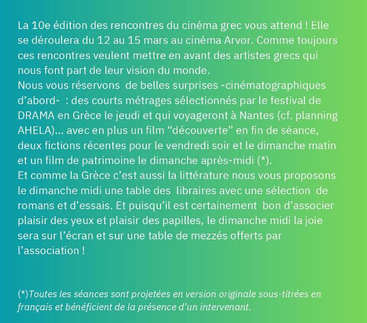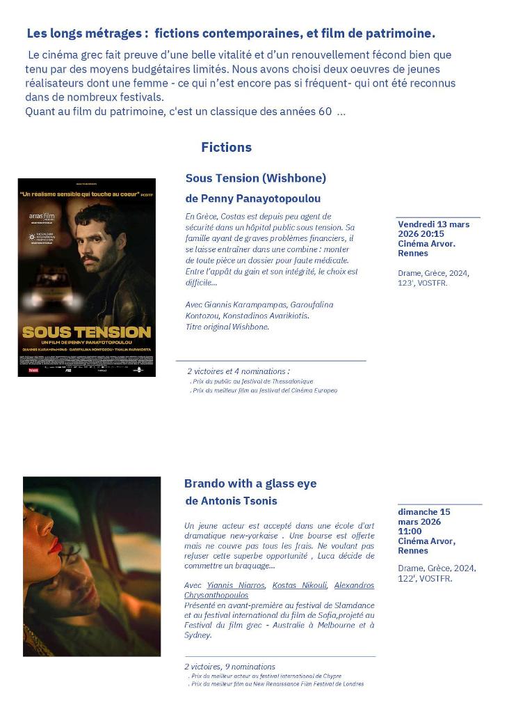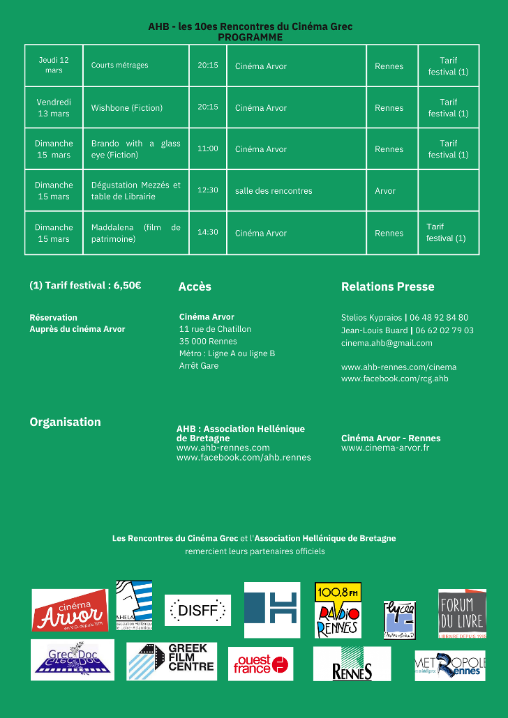 Festival de cinéma grec "les 10es Rencontres du Cinéma Grec" qui se déroulera du 12 au 15 mars au cinéma Arvor à Rennes.