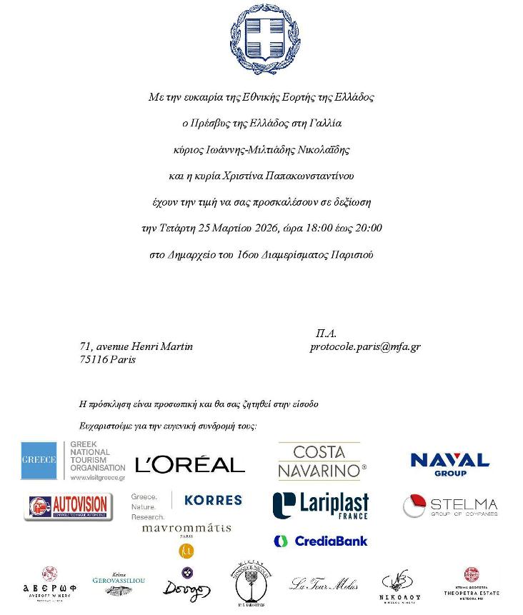 Πρόσκληση για δεξίωση Εθνικής Εορτής 25 Mαρτίου 2026, 18h00 -20h00 στο Δημαρχείο του 16ου