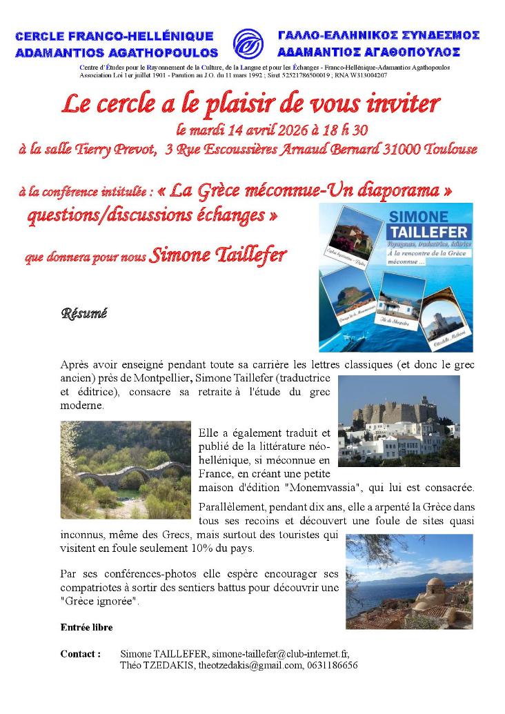 Le cercle a le plaisir de vous inviter le mardi 14 avril 2026 à 18 h 30 à la conférence intitulée : « La Grèce méconnue-Un diaporama » que donnera pour nous, Simone Taillefer.
